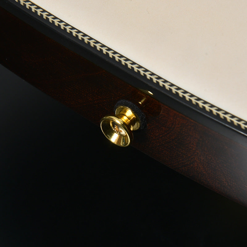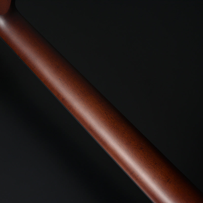 The moderately weighted nyatoh wood body provides excellent balance even when standing to play. It features herringbone-style binding around the body’s perimeter and a subdued, elegant color scheme.