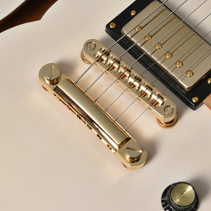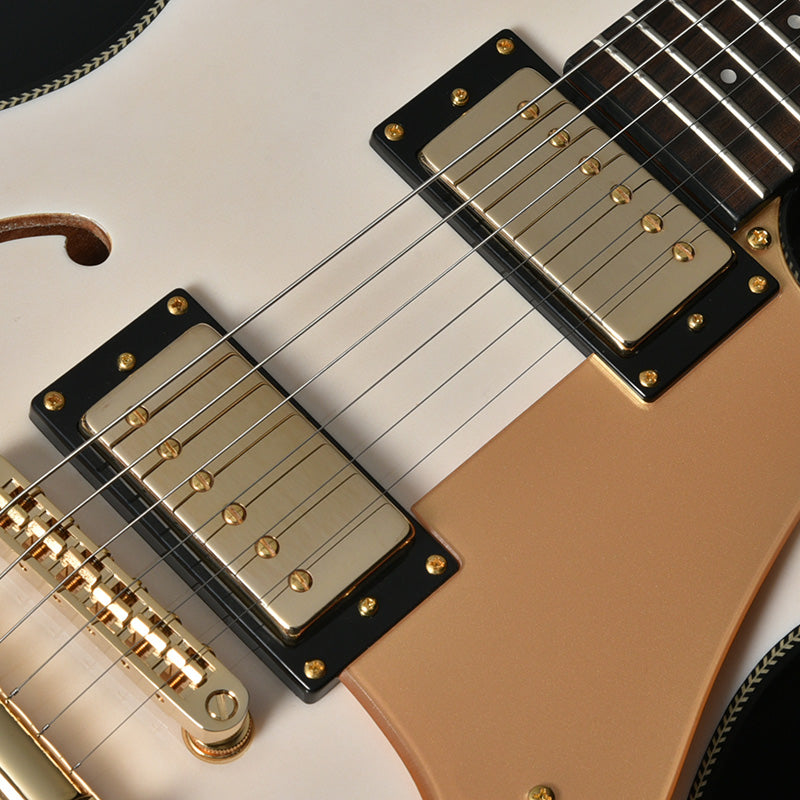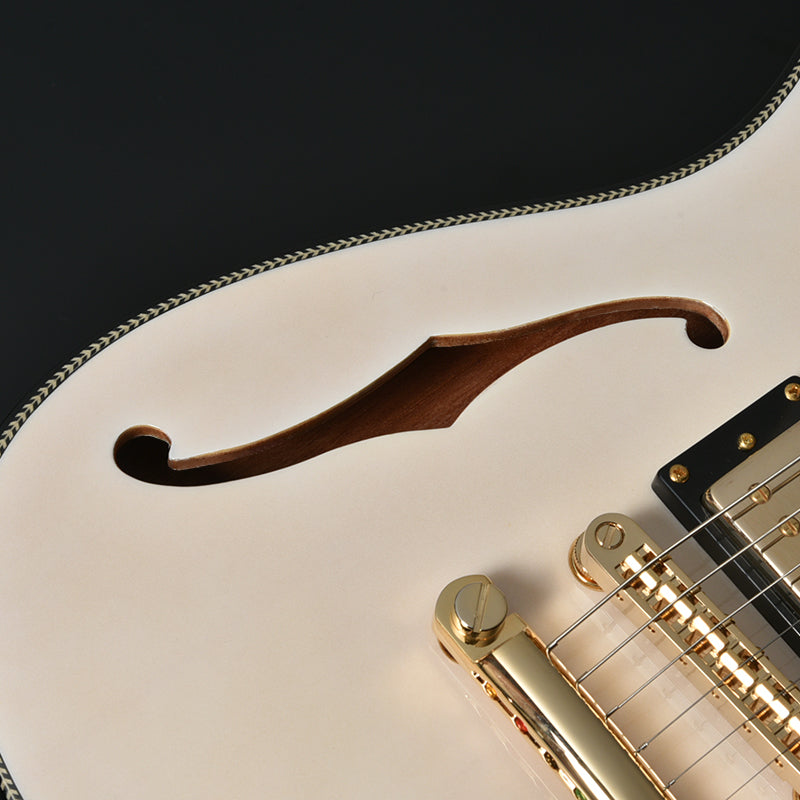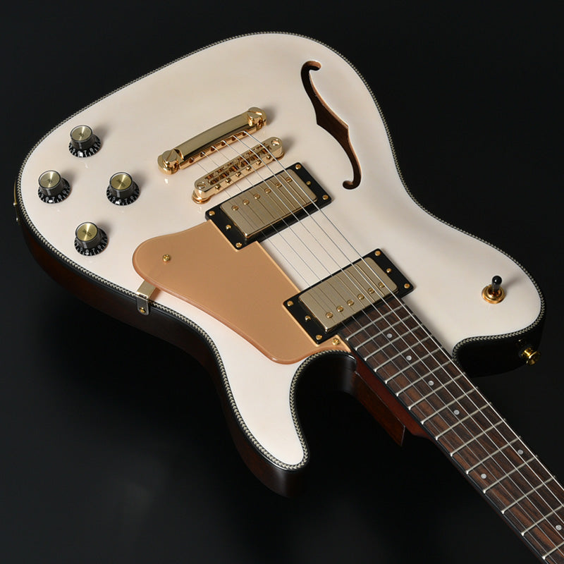 A new addition to the semi-hollow body BARON-JAZZ series features a stunning combination of Snow White finish and gold hardware. Its signature see-through finish showcases the wood’s natural character. Equipped with a matching acrylic pickguard, it pursues an even more luxurious look!